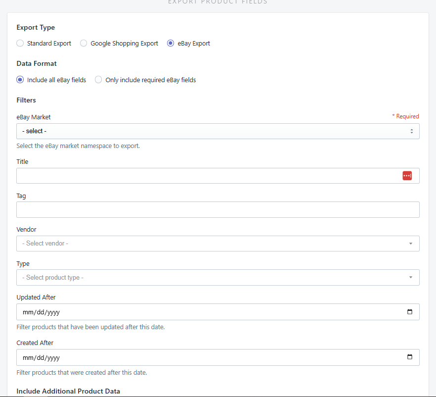 - Include all eBay fields / Only include required eBay fields – eBay-specific field selection